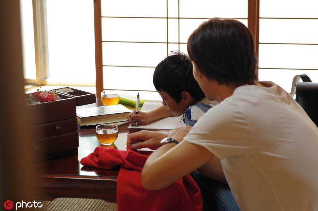 一位家长在辅导孩子功课。图源东方IC