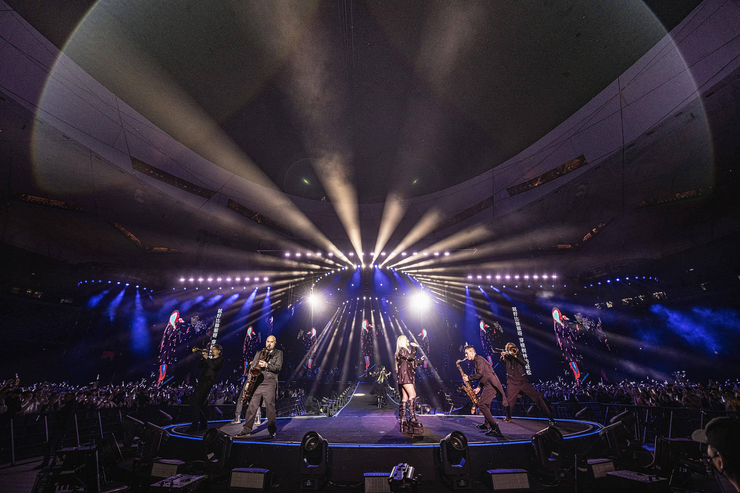 如果说杭州站是热血序章,那么北京鸟巢站便是将“沉浸式”理念发挥到极致的终极形态。除了超豪华延伸台,全球顶尖音响系统也被奉为此次北京鸟巢站的“神级配置”——当张惠妹在《趁早》中哽咽时,万人场馆竟能听见她呼吸的颤抖;而当《High High High》前奏响起,360°声场如海啸般席卷全场,让鸟巢接连两晚都注定成为不眠夜。同时,巨型屏幕呈现出的绚丽画面随着歌曲的节奏和情感变化而不断切换,时而如浩瀚星空般深邃,时而似热烈火焰般炽热,为观众打造出沉浸式的视觉体验。当数块大屏与千盏数控激光交织,将《跳进来》的赛博光影、《傲娇》的哥特美学、《身后》的极光幻境逐一投射,每一帧都堪比科幻大片。更有上万部应援棒根据不同曲目同步闪烁,将鸟巢化作流动的银河;特别是当《记得》的伴奏响起,四周一片静寂,纯黑色屏幕上只有一串串白色手写版歌词,简约却不简单,万人默契合唱一整首歌曲,成就演唱会上的经典瞬间。