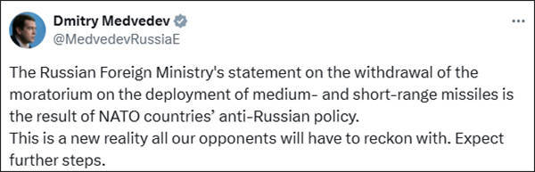 俄方称不再受中导条约约束,梅德韦杰夫:北约反俄的结果